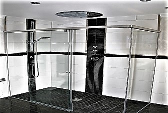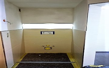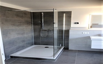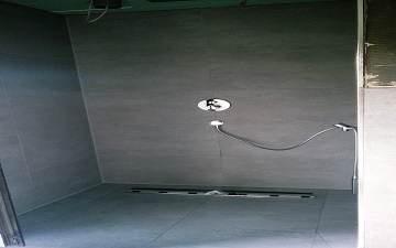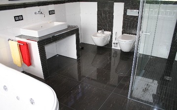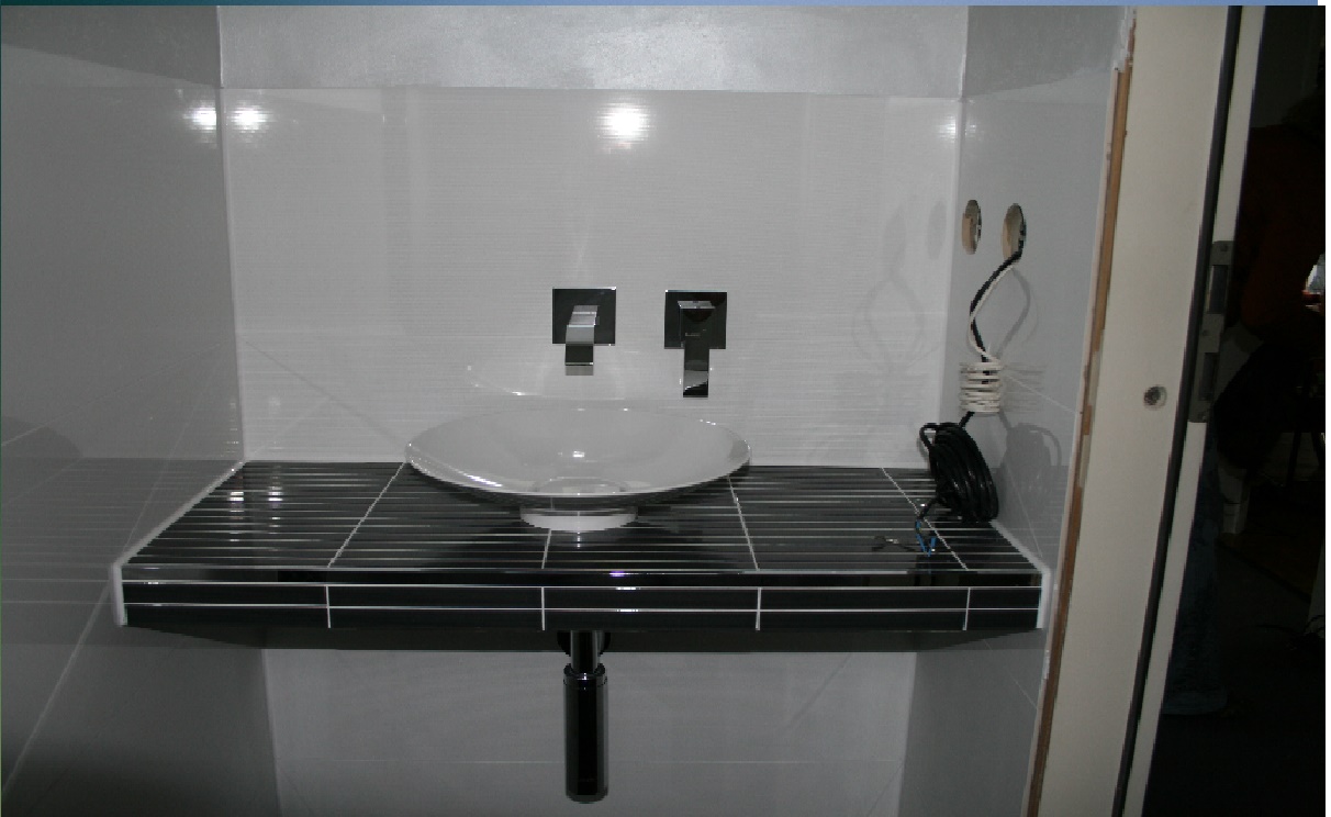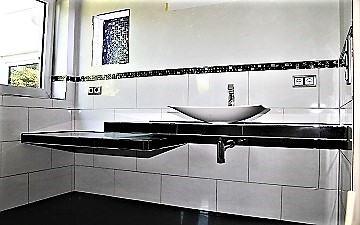 Wandfliesen 0,9m x 0,9m, Bodenfliesen ,6m x 0,6m mit Platineinschlüsse, Dekor 0,2m x 0,02m